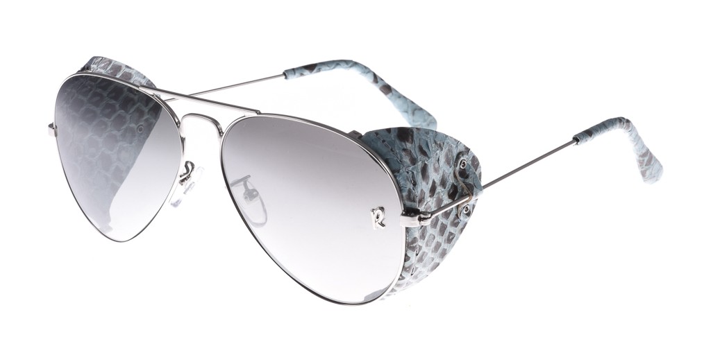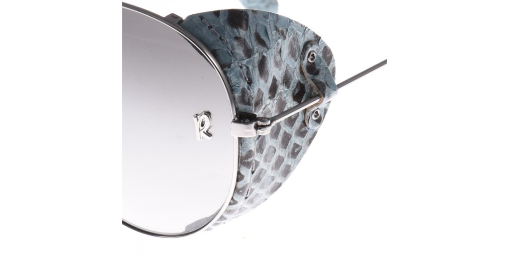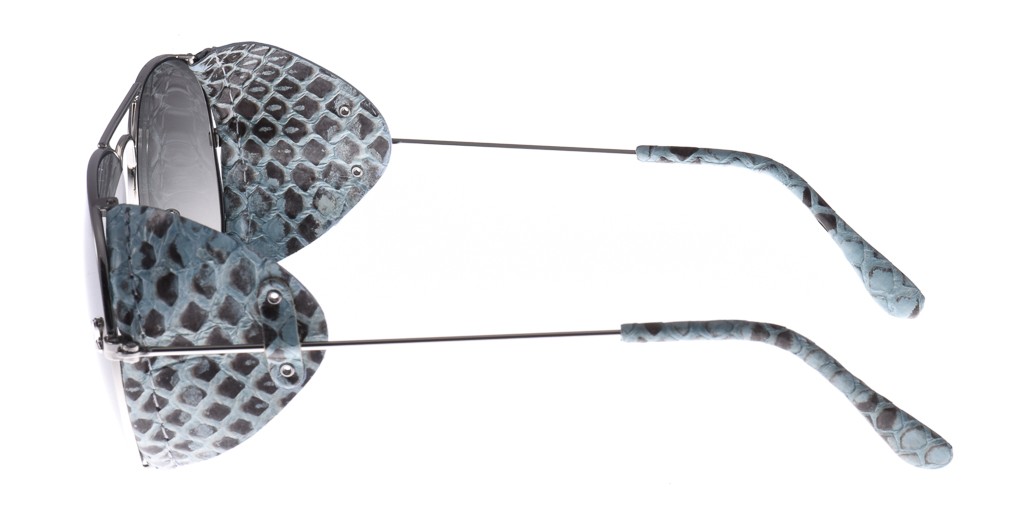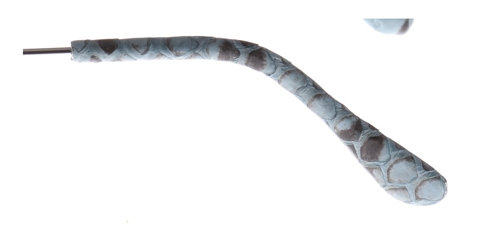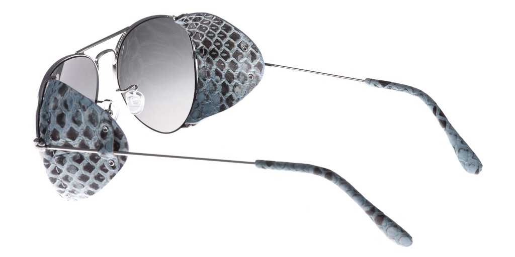 -Costruito in metallo color argento con dettagli in pelle azzurro pitonato